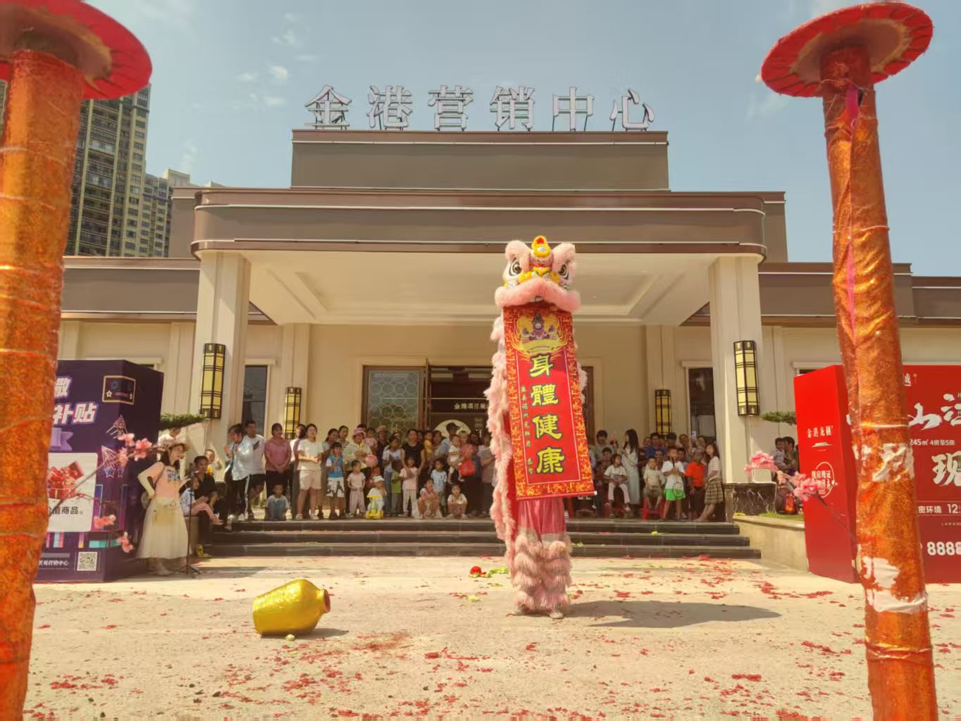 庆典伊始,“狮子点睛”仪式庄重举行。在众人的期待目光中,相关人员手持毛笔,蘸取朱砂,为醒狮点睛。随着朱砂点在狮眼上,寓意着赋予醒狮生命与灵性,也象征着金港营销中心自此生意兴隆、前程似锦。
